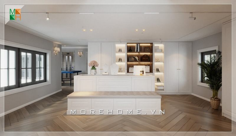 Thật tiện lợi với thiết kế nội thất phòng để đồ cao cấp theo phong cách hiện đại trẻ trung, độc đáo khi bố trí phần tủ bàn đảo kết hợp ghế ngồi trong không gian biệt thự