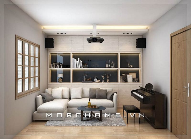 Mẫu kệ sáchhiện đại kết hợp kệ trang trí gỗ công nghiệp được thiết kế âm tường tạo nên không gian rộng rãi đang được nhiều gia chủ yêu thích và sử dụng