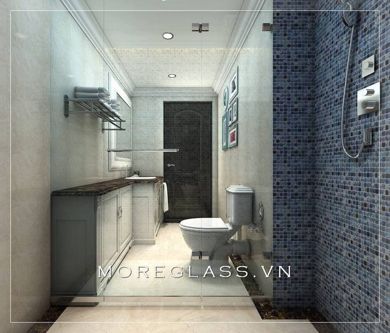 Mẫu thiết kế phòng vệ sinh đẹp sử dụng gạch ốp tường tông màu sáng kết hợp bức tường phòng tắm tông màu xanh sẫm tạo điểm nhấn cho căn phòng.