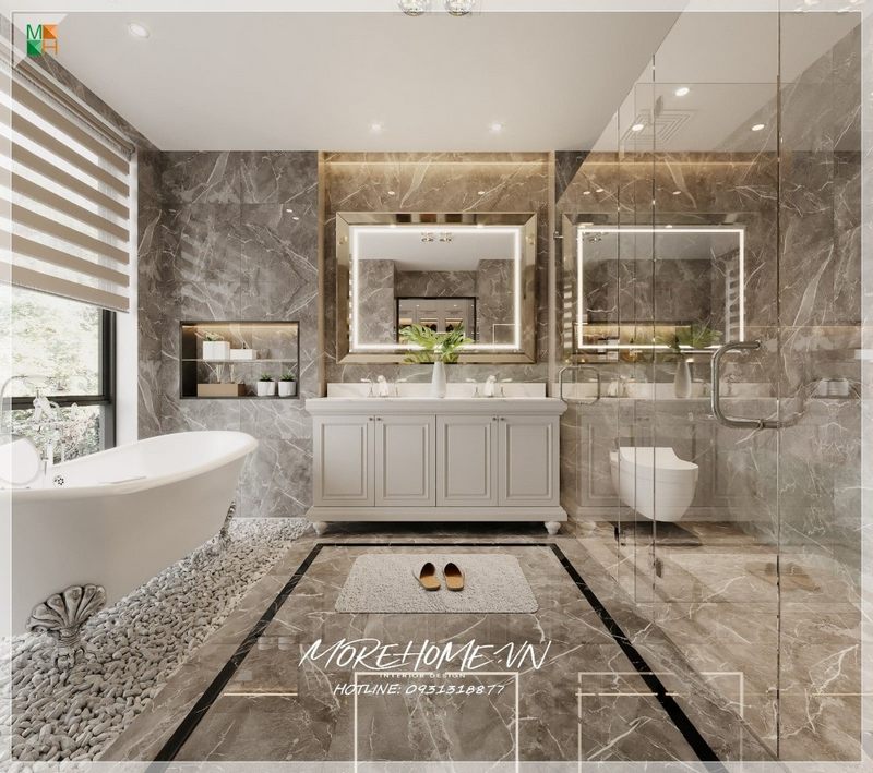 Mẫu thiết kế phòng tắm master có bồn tắm siêu sang chảnh, sử dụng đá ốp nhân tạo xám vân mây cùng các thiết bị vệ sinh cao cấp, đảm bảo không gian thư giãn tối ưu cho gia chủ