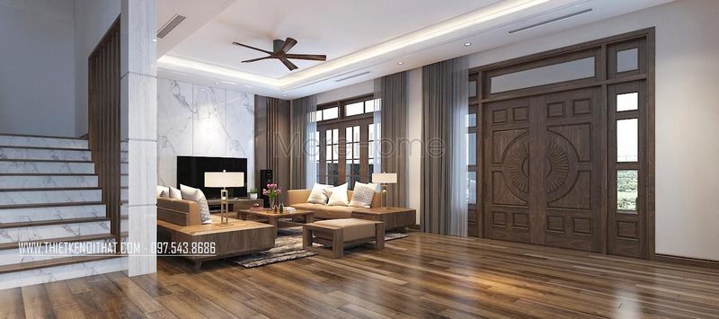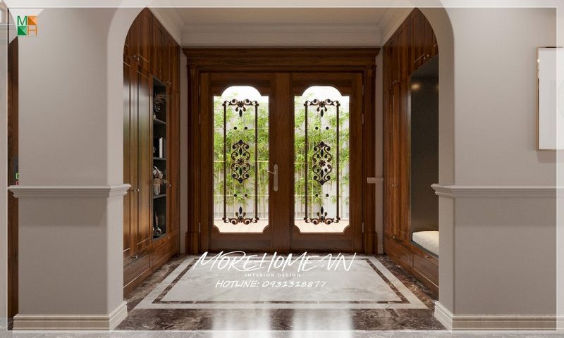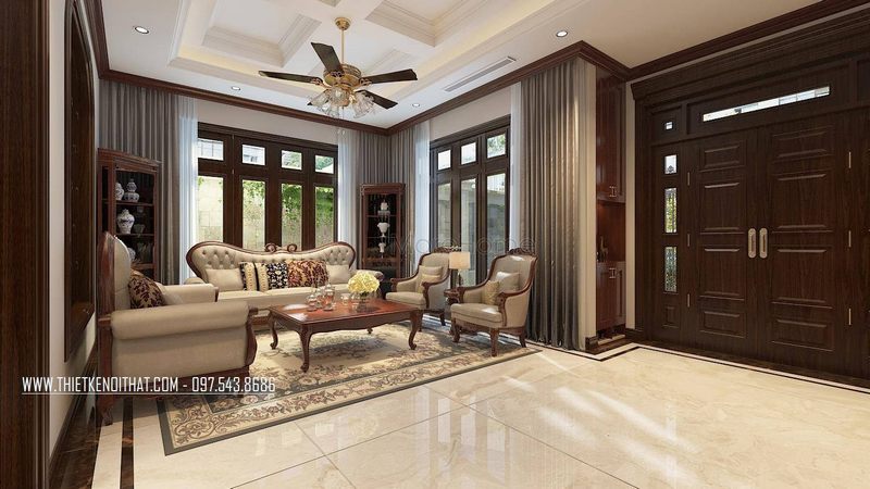 Mẫu cửa gỗ 2 cánh màu nâu sang trọng tạo điểm nhấn cuốn hút cho phòng khách biệt thự tân cổ điển